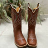 Bota Texana Bordado Pontilhado Azul Claro e Florão Couro Marrom fabricada toda com couro 100% legítimo.
