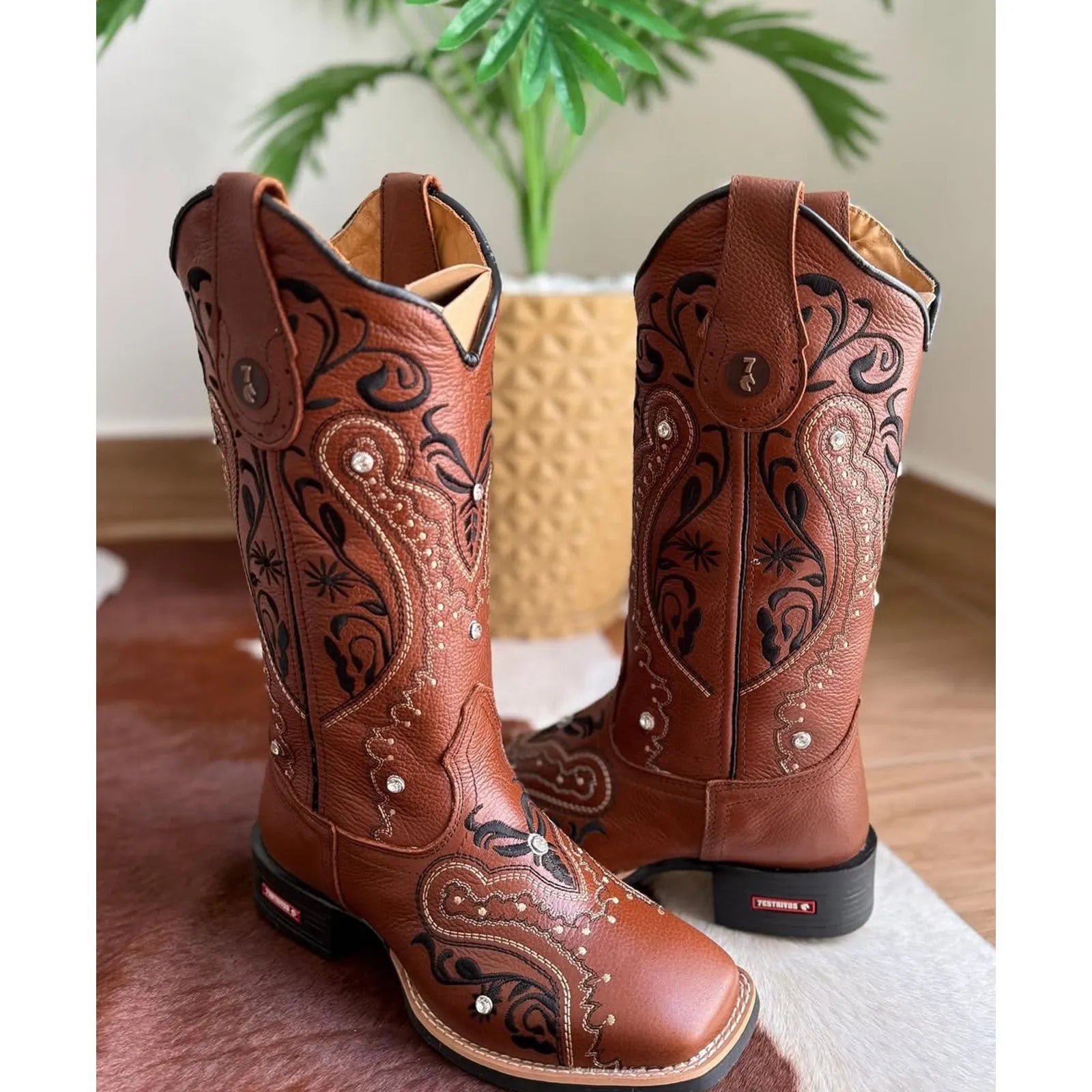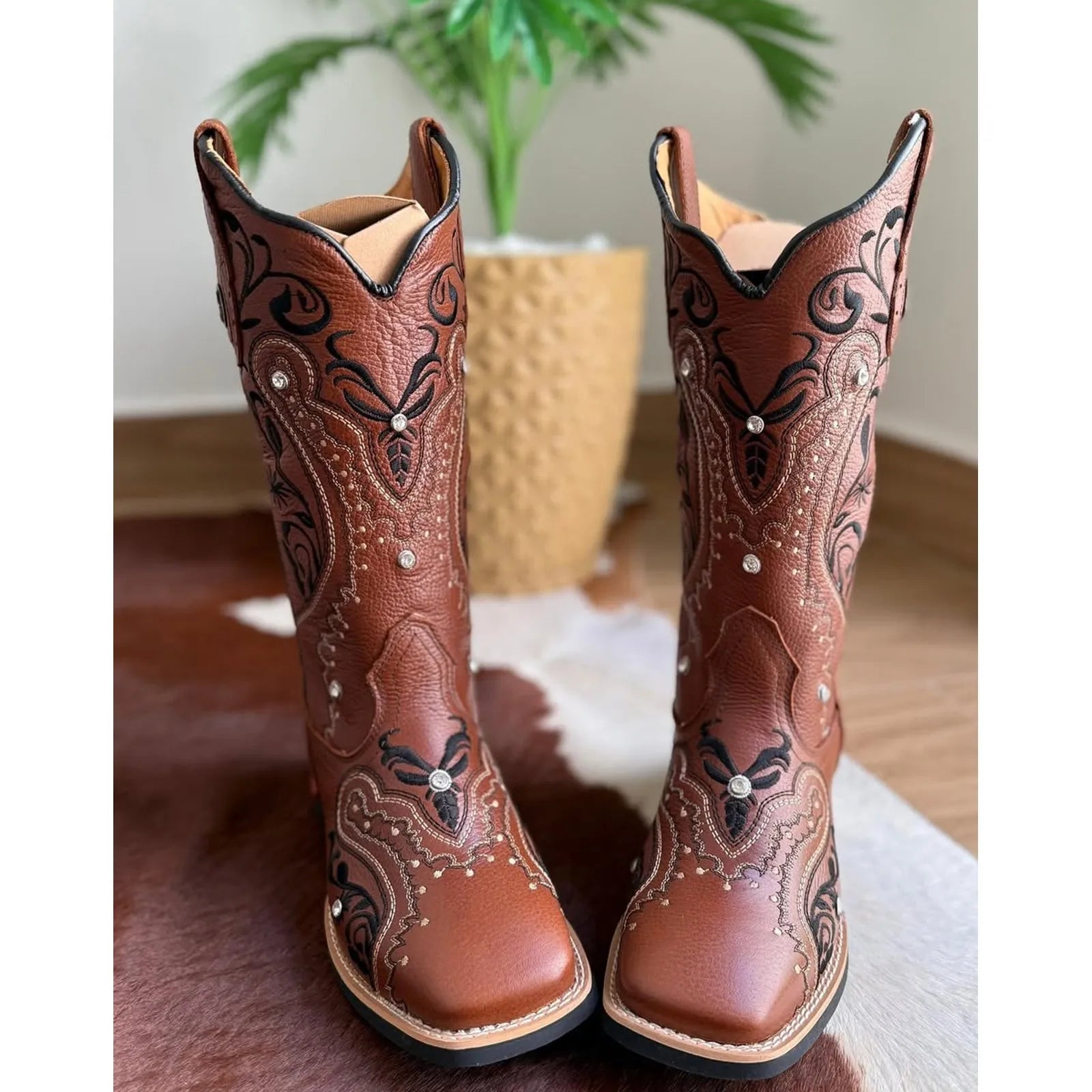 Bota Texana – Couro Látego Bordado Florência Preto e Bege Com Strass