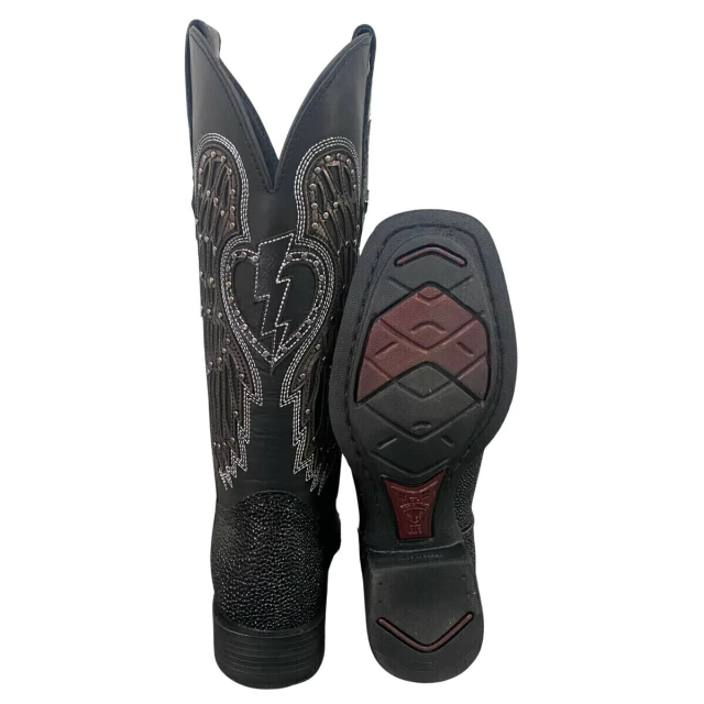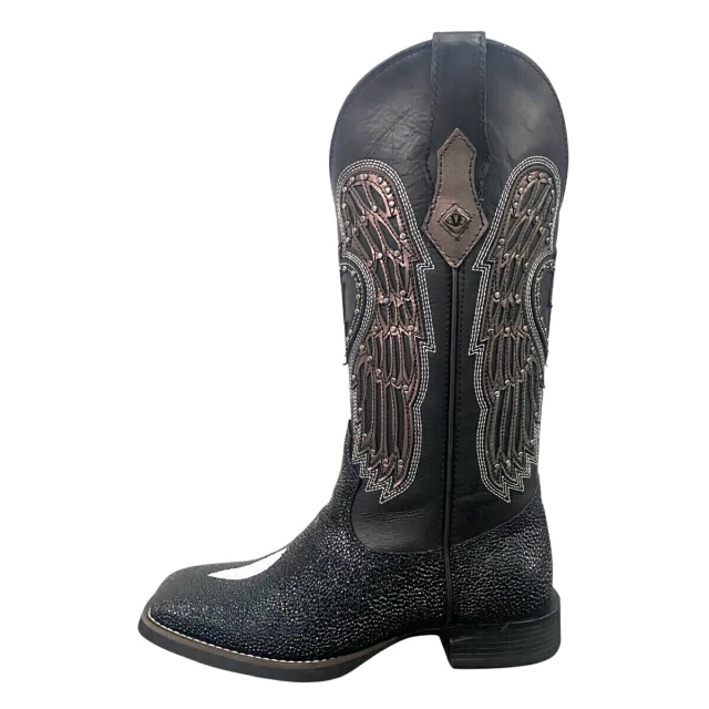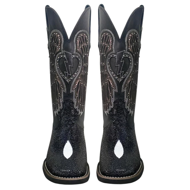 Com bico quadrado e acabamento de alta qualidade, esta bota é confeccionada em couro bovino réplica Arraia na cor preto. O cano alto de 35 cm, adornado com brilhos e detalhes, confere um toque especial ao seu visual.