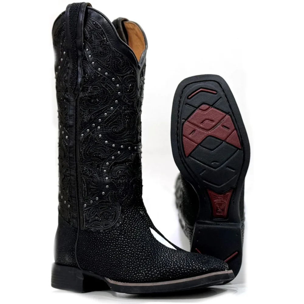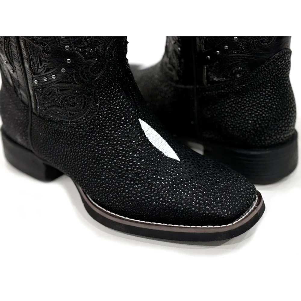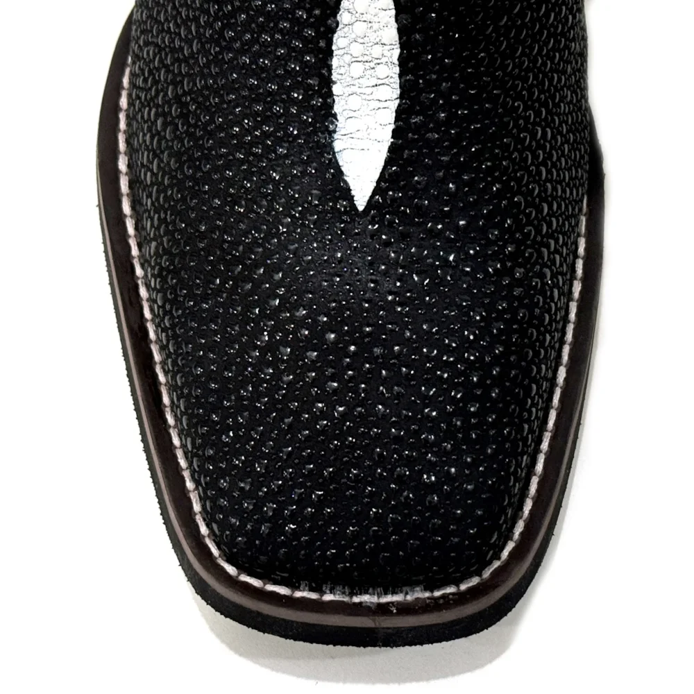 Pé fabricado em couro bovino, com réplica que lembra couro de arraia, na cor Fossil Preto. Bico quadrado.