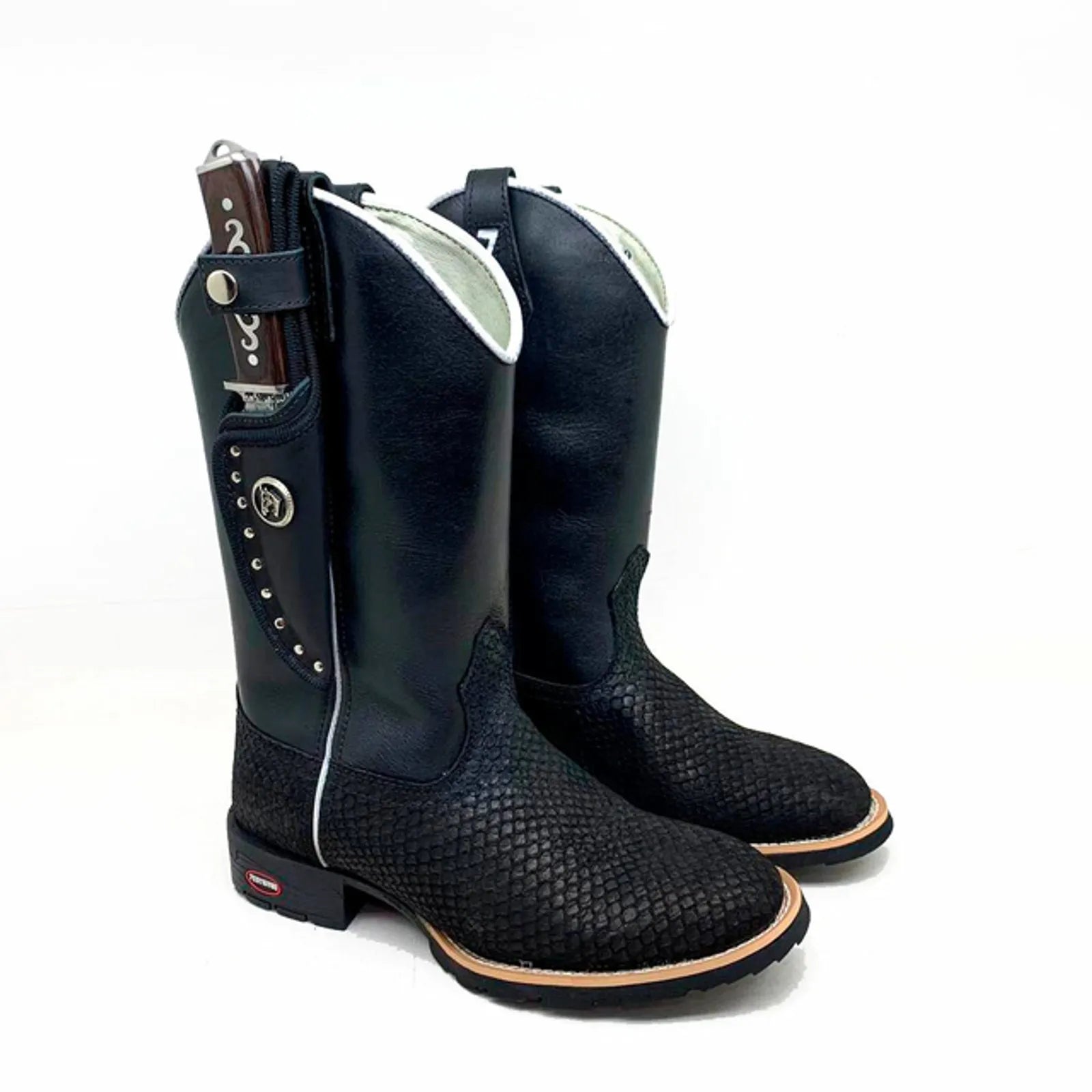 BotaFaca Econômica – Couro Cano Látego Preto | Couro Gáspea Nobuck Preto Estilizado em Tilápia | Bico Redondo