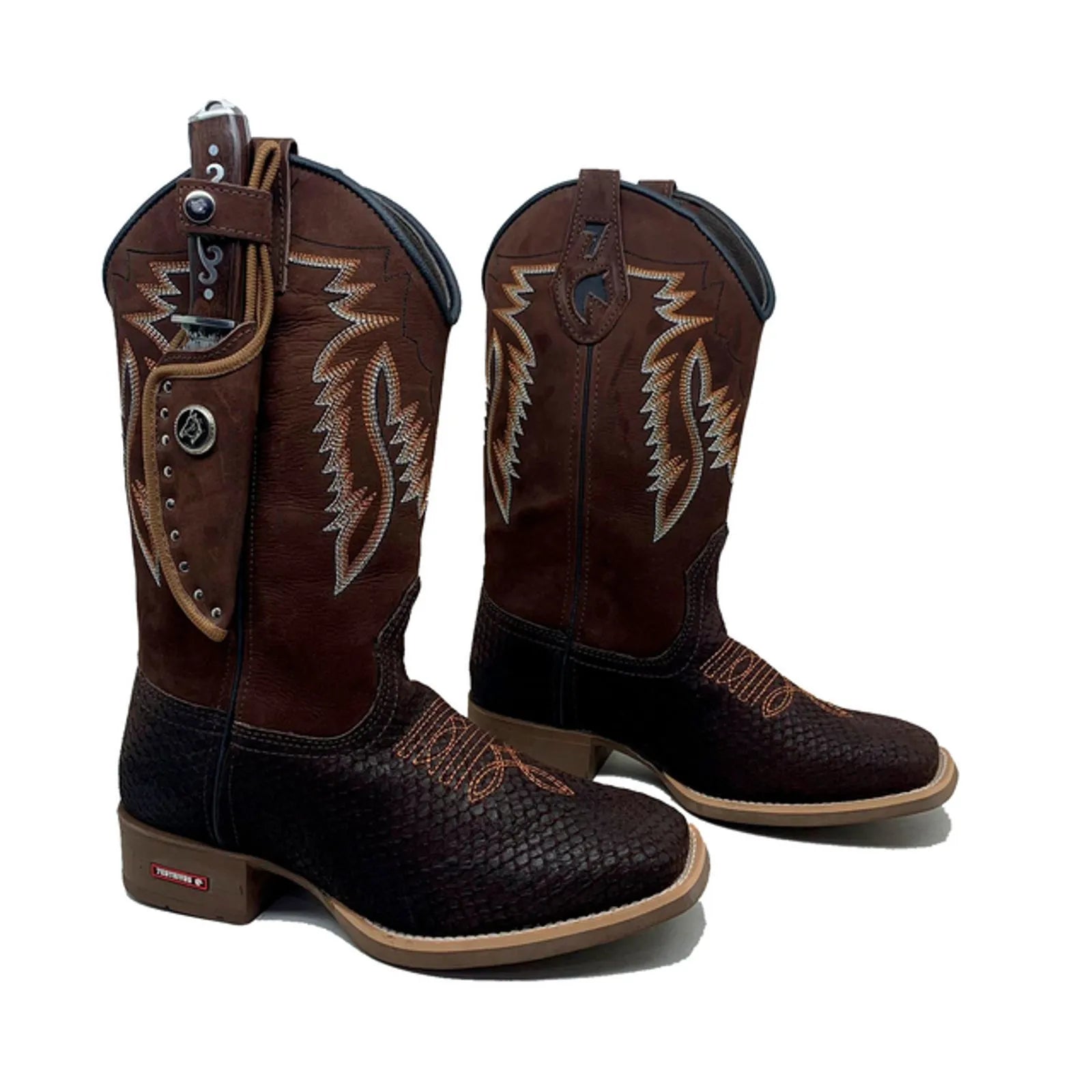 BotaFaca Raiz – Couro Nobuck Chocolate | Gáspea Estilizado em Tilápia Marrom | Bordado Ferrugem