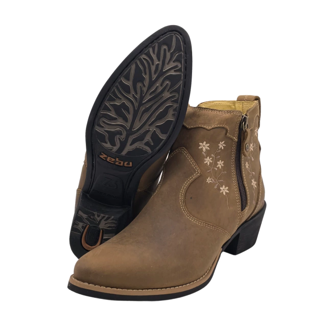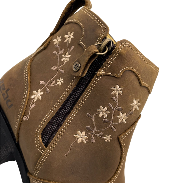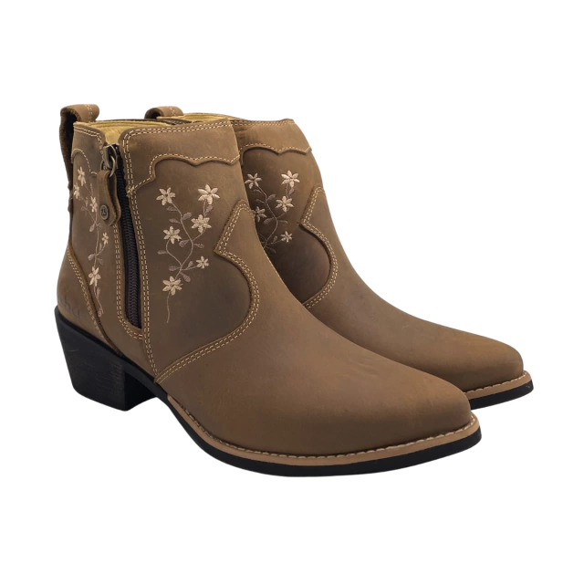 O design desta botina destaca-se pelo bico fino e salto de aproximadamente 5 cm, conferindo um visual moderno e feminino. O bordado de flores adiciona um toque delicado e exclusivo, tornando o calçado ainda mais charmoso. Para maior praticidade, possui zíper em ambos os lados, facilitando o calce.