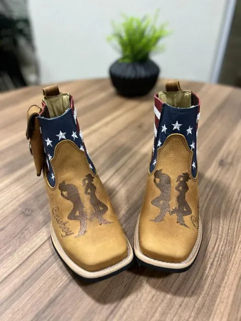 Botina Guilherme com Kit Canivete – Couro Fóssil Havana/ Bordado Cowboy Americano