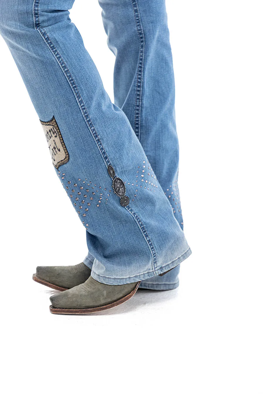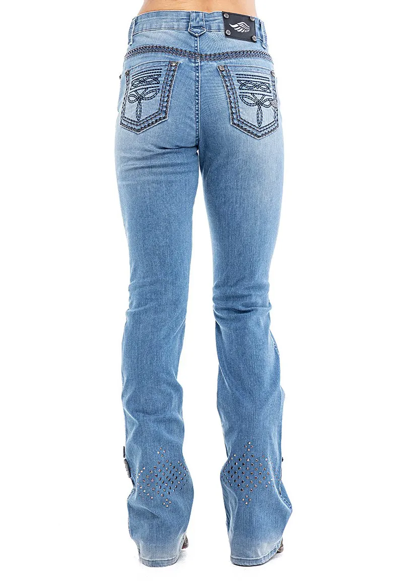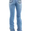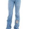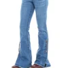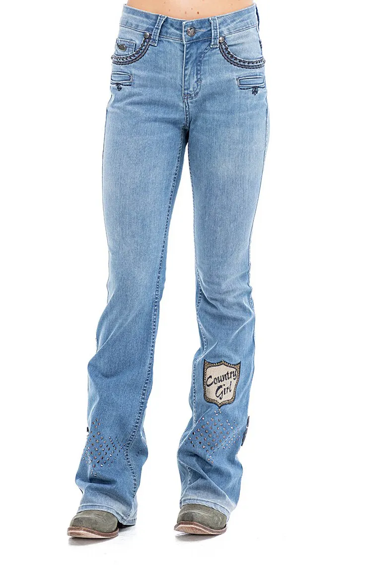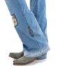 Calca jeans country modelagem flare em cos medio. Bordado com pontos decorativos na pala e bolsos frente e costas. Barra com abertura nas laterais e botoes de metal.