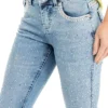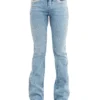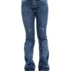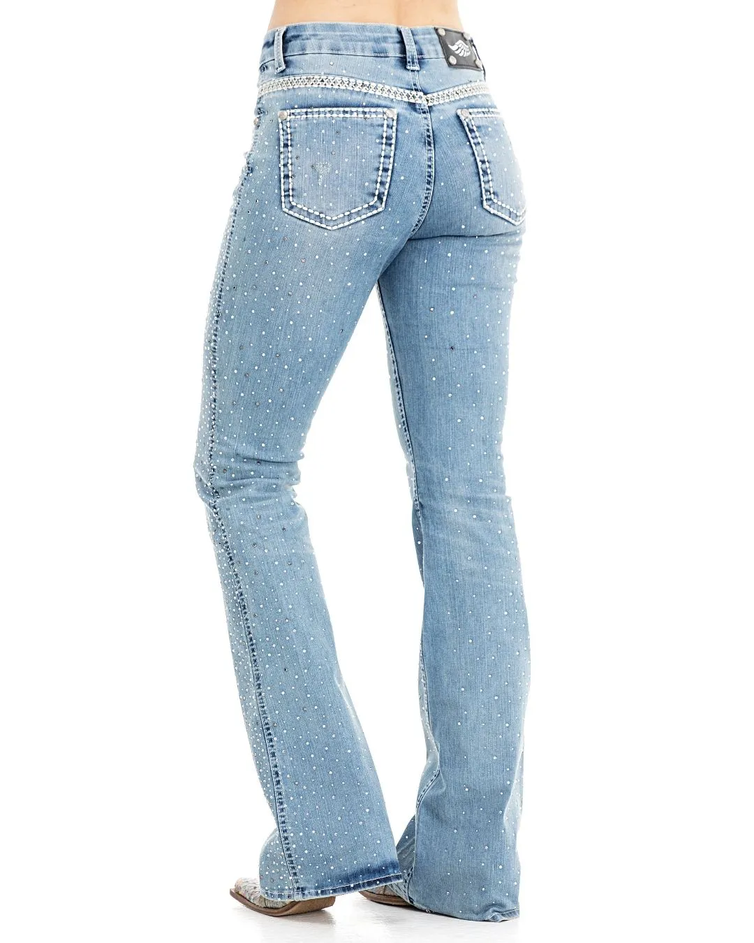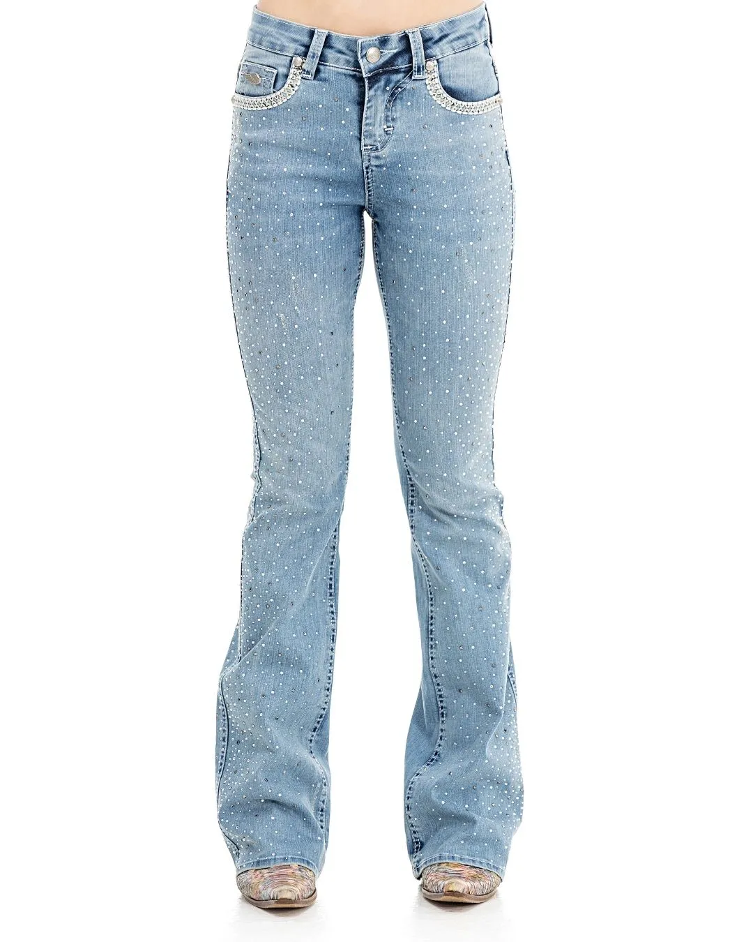 Calca jeans country modelagem flare cos medio. Decoracao com mix de cristais por toda a peca frente e costas. Bolso frontal e bolsos traseiros com pontos de bordado decorativo. Lavanderia clara.