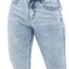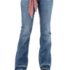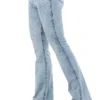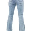 Calca jeans country modelagem flare em cos medio. Bordado com pontos decorativos na pala e bolsos frente e costas. Decoracao de pedraria de alto brilho frente e costas, cristais que brilham com nuance de azul. Aviamentos personalizados.