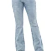Calca jeans country modelagem flare em cos medio. Bordado com pontos decorativos na pala e bolsos frente e costas. Decoracao de pedraria de alto brilho frente e costas, cristais que brilham com nuance de azul. Aviamentos personalizados.