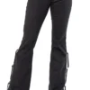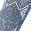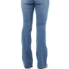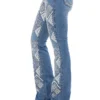 Calca jeans country modelagem flare em cos medio. Bordado com pontos decorativos na pala e bolsos frente e costas. Decoracao de padronagem geometrica bordada na frente, sobreposta por pedraria. Lavagem media com detalhe de leves desgastes.