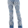 Calca jeans country modelagem flare em cos medio. Bordado com pontos decorativos na pala e bolsos frente e costas. Decoracao de padronagem geometrica bordada na frente, sobreposta por pedraria. Lavagem media com detalhe de leves desgastes.