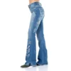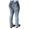 Modelagem Flare, cós médio, com bordados decorativos rústicos na pala, bolsos traseiro eboca do bolso da frente na cor Branca.