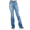 Modelagem Flare, cós médio, com bordados decorativos rústicos na pala, bolsos traseiro eboca do bolso da frente na cor Branca.