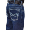 O detalhe em azul bordado no bolso adiciona um toque de sofisticação ao modelo, enquanto a cor jeans proporciona versatilidade para diversas combinações.