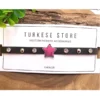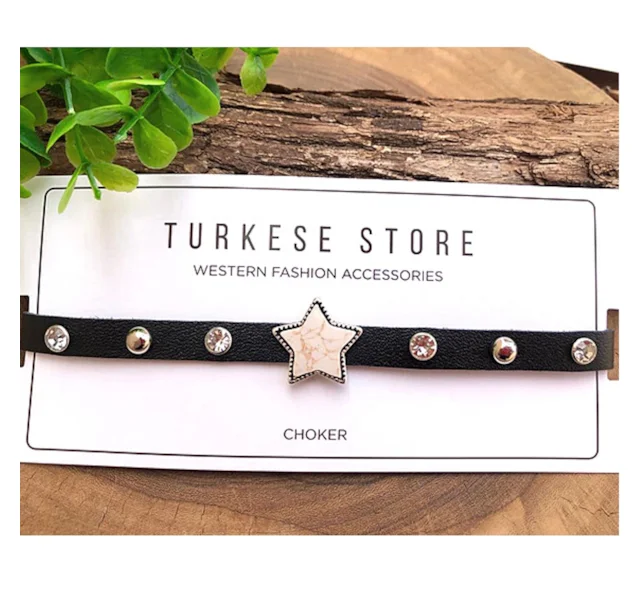 Confeccionado em couro na cor Preto com pingente de Estrela na cor Off White Marmorizado e rebites em metal com pedra de strass.