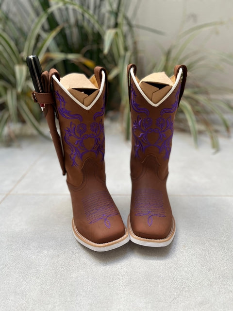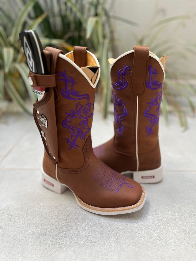 Kit Texana Bordado Flores Roxas Couro Marrom + Bainha + Faca fabricada toda com couro 100% legítimo.