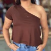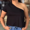 Seu design assimétrico, com uma manga só, proporciona um visual diferenciado e atual, permitindo combinações versáteis com jeans, shorts ou saias. O caimento soltinho valoriza todos os tipos de corpo e oferece liberdade de movimentos durante o dia a dia.