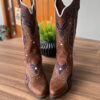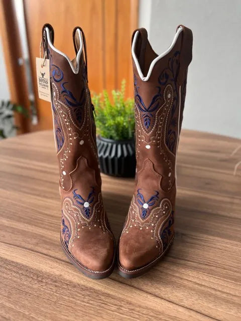 Texana Alice Bico Fino – Couro Horse Nescau/Bordado Tribal Azul