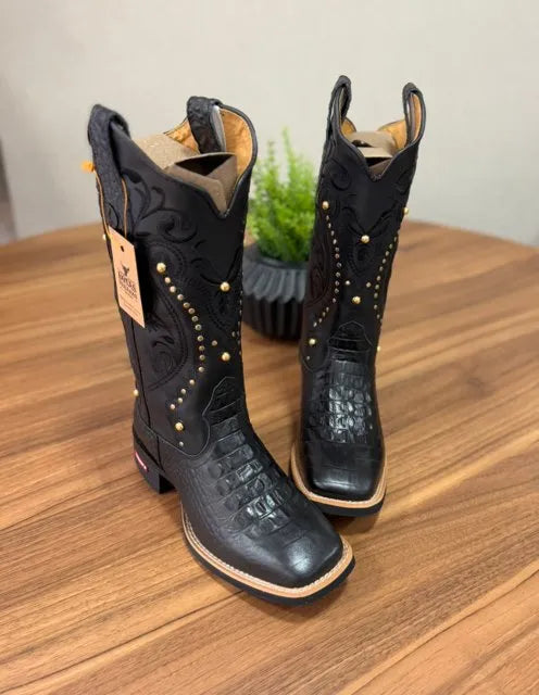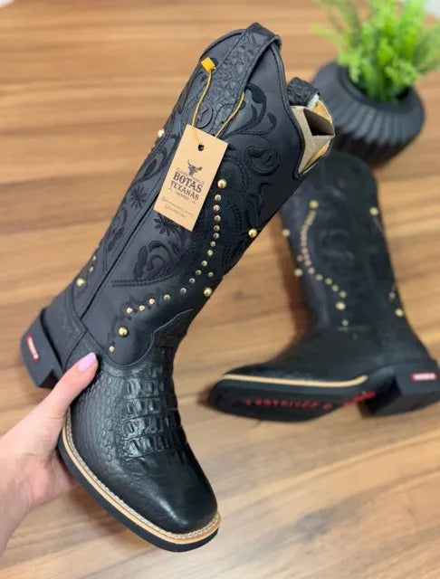 Texana Alice – Couro Látego Preto e Jacaré/Bordado Tribal Preto e Metais Dourados