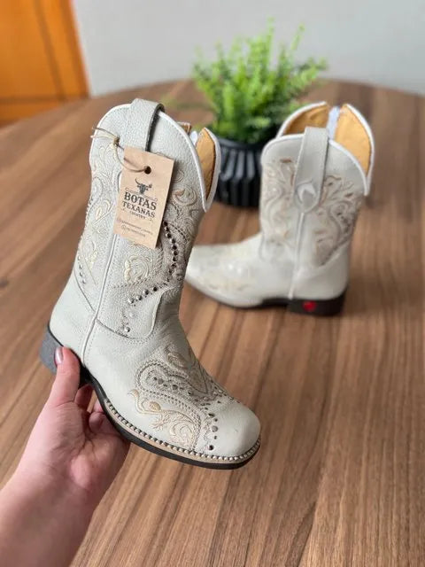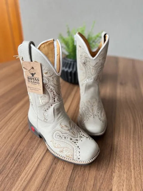 Texana Alice Infantil – Couro Off-White/Bordado Tribal Bege