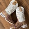 Texana Anelise – Couro Floatter Branco e Nobuck Areia/Bordado Flores e Cavalo Lilás