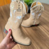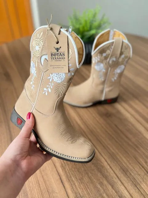 Texana Cecília Infantil – Couro Nobuck Areia/Bordado Flores Branco e Bege