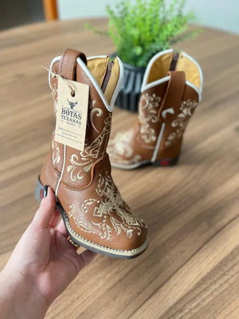 Texana Maria Infantil – Couro Mustangue/Bordado Padroeira e Cruz Bege
