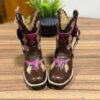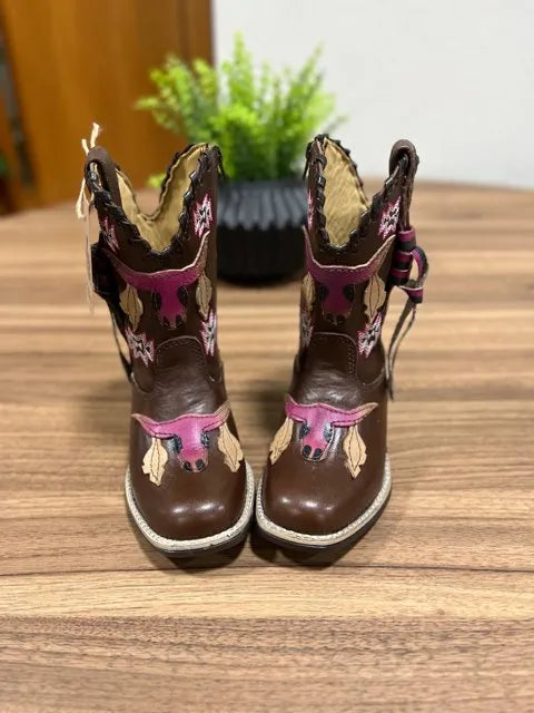 Texana Pietra Infantil – Couro Látego Marrom/Bordado Touro 3D Rosa
